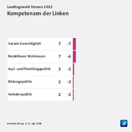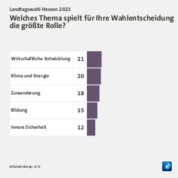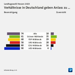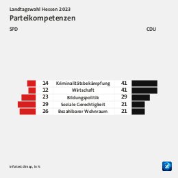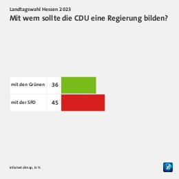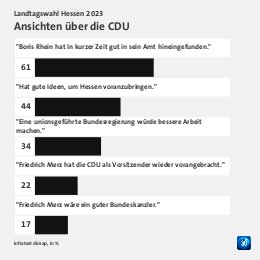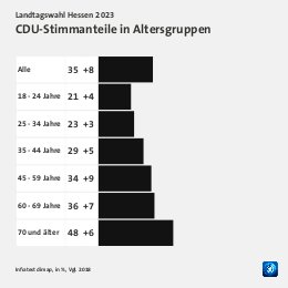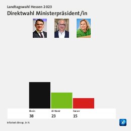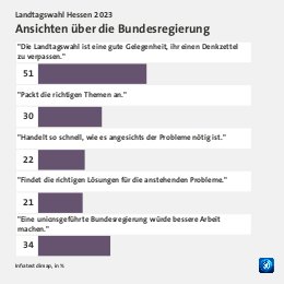 Grundgesamtheit: Wahlberechtigte in Hessen Erhebungsmethode: Zufallsbasierte Telefon- und Online-Befragung Erhebungszeitraum: 02. bis 04. Oktober 2023 Fallzahlen: 1.188 Befragte (697 Telefoninterviews und 491 Online-Interviews) Schwankungsbreite: 2 Prozentpunkte bei einem Anteilswert von 10%; 3 Prozentpunkte bei einem Anteilswert von 50%